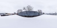 An abandoned train sits in a snowy field in Toronto, surrounded by tall trees and other buildings. The gloomy grey sky adds to the desolate landscape. A glimpse into Toronto's industrial past.
