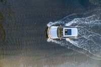This stock photo features an aerial view overlooking a boat floating on the river in Los Angeles, California, USA. The boat is surrounded by open space and water. The image captures a clear, sunny day from a high position, providing a unique perspective of the suburban residential area. The top-down view showcases the beautiful water and wet surroundings in this elevated shot.