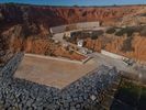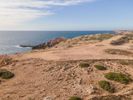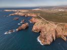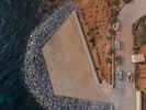 Aerial view showcasing Portugal's coastal landscape with a clear sky. The harbor, boat ramp, and concrete surfaces create a stunning view from an elevated position, highlighting the ocean and pier.