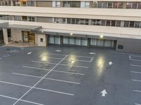 Aerial view of a modern architecture building in Los Angeles. The high-rise structure is surrounded by a concrete parking lot and features a courtyard. The top-down perspective highlights the urban design.