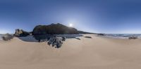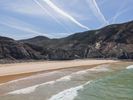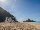 Aerial view of Portugal's coastal beach in Europe, showcasing sandy shores and ocean under a clear sky. Contrails and sunshine add to this scenic landscape, observed from a high position.