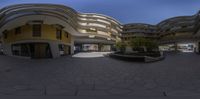 Aerial view of a modern urban landscape in Germany. The straight road lined with buildings and plants in pots. Hard shadows create a dramatic effect. The elevated perspective showcases the city's architectural design.