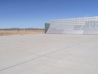 An airplane sitting on an airport runway on a clear day in California, USA. The image showcases the beautiful architecture of the airport, including the concrete surface and metal walls. Surrounding the airport is a stunning landscape of sand dunes, limestone formations, and open space, characteristic of the natural environment in California. The clear sky and absence of clouds or rain allows for a perfect vacation backdrop. This stock photo would be ideal for travel-related content or designs.
