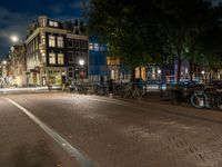 This image captures the vibrant city life in Amsterdam, Netherlands at night. Bicycles are parked along the sidewalk in front of a classic architecture building, surrounded by trees and other buildings. The dark night sky sets the scene, illuminated by street lights. The residential area showcases the unique urban design and infrastructure of Dutch cities. This photo portrays the combination of classic architecture, artificial light, and the bustling atmosphere of the city. It represents the charm and energy of Amsterdam's city life.