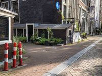 street with lots of buildings and potted plants in the middle of it next to an older brick building