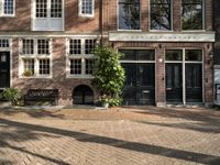 A classic architecture residential area in Amsterdam, Netherlands. The facade of the buildings showcases the charm of Dutch architecture. The road, lined with brick pavers, adds to the urban design of the city.