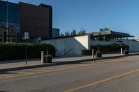 This stock photo features a modern architecture building located in Toronto, Canada. The building stands tall in a bustling business district, surrounded by a vibrant neighborhood. The well-maintained road, lined with trees and vegetation, provides a pleasant view for pedestrians and motorists alike. The clear sky above highlights the contemporary design of the office building, casting intriguing shadows on the road surface. The hard shadow from the building's structure adds an element of depth to the composition. Overall, this photo captures the beauty of urban design and the dynamic atmosphere of Toronto, an iconic city in Canada.