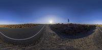 Arizona's asphalt road at dawn leads straight down the landscape towards Monument Valley in Utah. Clear skies mark the break of day in the USA. A nature scene reminiscent of Forrest Gump's journey.