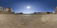 360 - turn view of the desert area with a large rock formation in front of a bright sunlit sky