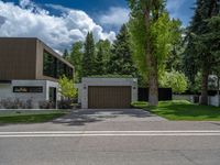 A peaceful suburban scene in Colorado, USA. Lush greenery surrounds residential areas. Aspen trees lining the asphalt road under a clear day sky. Tranquil profile of a suburban neighborhood.