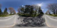 a 360 - angle view of a long asphalt road near trees, with the sun reflecting off the shadows of the street