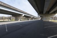 This is an image of a large bridge spanning over a parking lot, with an empty road for cars to drive across. The bridge is made of composite material and the road surface is made of asphalt. The open space of the parking lot contrasts with the concrete underpass below the bridge. Above, the sky is partly covered with clouds. This photo showcases the infrastructure of a bridge and the functionality of a parking lot, providing a packshot of urban transportation and open spaces.
