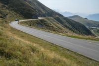An asphalt road winds through a picturesque landscape of mountains, grassy plains, and serene lakes. The road surface curves along the terrain, offering breathtaking views of the surrounding nature. Explore the beauty of Italy's countryside.