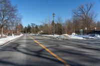 This is an image of a snow-covered suburban road in Ontario, Canada. The straight road leads to a stoplight at the side, giving it a residential and recreational feel. The clear sky above contrasts with the snowy road and the surrounding park. This photo represents a typical winter day in the suburbs of Ontario, specifically in Toronto.