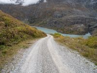 This is an image of a rugged gravel road located in Austria, Europe. The road stretches straight through the scenic landscape, surrounded by mountains and a beautiful lake. The grey sky adds to the gloomy atmosphere of the area. The rough surface and off-road track make it an ideal spot for nature enthusiasts and those seeking adventure. This photo captures the rugged beauty of the Austrian wilderness on a cloudy day.