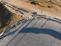 an aerial view of a park that is surrounded by hills and grass and rocks with an empty bench to the side