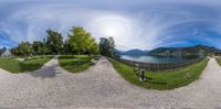 An expansive view of Zell am See, Austria. The clear sky reflects on the calm lake, surrounded by majestic mountains. A peaceful day in the European landscape, with an open space and an overlook bench.