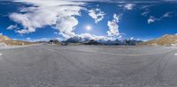 a 360 - shot of an asphalt road with a sky background and snow capped mountains in the distance