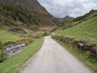 This photo captures a small rural road in Austria, surrounded by majestic mountains and trees. The landscape showcases the natural beauty of Europe, with a cloudy and gloomy sky in the background. The road, covered in dirt and gravel, gives a sense of the rural and untouched nature of the area. The wet conditions add to the atmosphere, creating a serene and peaceful scene. This image represents the charm of the Austrian countryside and the scenic routes that can be explored in this part of Europe.
