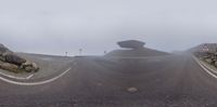 three roads surrounded by rocks and in the fog with a small building in the distance