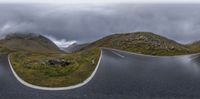 a couple of curved curves on a mountain road between mountains with clouds rolling in the background