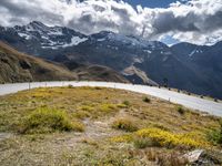 A scenic road in Austria winds through the mountainous landscape. Lush green grass and vegetation cover the open spaces along the way. The clear sky provides a stunning backdrop to this picturesque European scene.