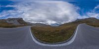 a panoramic image of two curved roads on a grassy field and mountains in the background