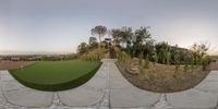 A serene backyard oasis in Los Angeles, California. Stone floors and a lush grass surface lead to a staircase. The outdoor artificial putting area is perfect for golf enthusiasts. Enjoy the scenic view of the mountains and clear skies.