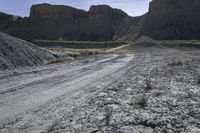 dirt road leads to large rocks in a badlands landscape, with a sign posted at the end