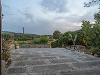 Rural road in Majorca, Spain at dawn. Surrounded by agriculture and open space, typical of the Balearic Islands. Clouds mark the beginning of the day in this European farm home setting.