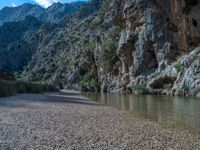Natural open space in Majorca, Spain, showcasing a rugged landscape with rock walls and canyons. Daytime view of the Balearic Islands' gravel surfaces and walls, blending with European nature.