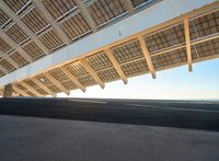A stunning architectural composition in Barcelona at dawn. The low-lying coastal structure juxtaposes with the clear sky and ocean horizon. Suburban roads and residential buildings create a composite landscape. Solar panels line the surface, casting hard shadows.