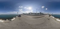 a fisheye image of the waterfront, and a parking lot and buildings in the background