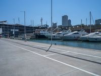 A modern architecture pier in Barcelona, Spain. The concrete surface blends with the clear sky and coastal skyline. The jetty offers a landing spot with ocean views. Barcelona's urban waterfront at its finest.