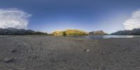 A serene beach on the Balearic Island of Mallorca, with a backdrop of majestic mountains and a tranquil river. The clear sky reflects on the calm surface of the water, creating a peaceful atmosphere.