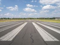 This stock photo features a large airport in Berlin, Germany. The runway is seen with many lines on the asphalt, indicating a well-maintained road surface. However, currently, there are few people riding bikes down the runway. The landscape surrounding the airport is a wide-open space, with a straight road leading into the distance. The field is covered with green vegetation consisting of trees and plains. The sky is clear, with clouds on the horizon. This photo showcases the urban design and recreation opportunities of the area, as well as the extensive land lot of the airport. Located in Europe, this airport is known as Tempelhof Airfield. The image was captured during the day, highlighting the vibrant nature of the park and the dynamics of the airport runway.