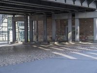 This is an image of a city road in Berlin, Germany. The architecture of the buildings and houses creates a unique urban design. The road surface is made of concrete and asphalt, while the bridge and underpass are made of steel and column structures. The image shows the reflection and shadow created by the metal beams. The cobblestone line on the floor adds charm to the city's urban atmosphere. This photo represents city life in Berlin, a vibrant European city with an art district and stunning urban infrastructure.
