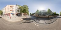 A fish-eye lens captures the view of Berlin's cityscape, showcasing its unique architecture and urban design. Streets lined with buildings, bridges, and public spaces create a vibrant and dynamic atmosphere. This snapshot represents the essence of the city.