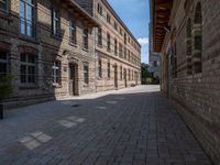 This image captures the essence of city life in Berlin, Germany. The brick sidewalk stretches between two tall buildings, casting hard shadows in the clear sky. Lining the side of the buildings are trees, adding a touch of nature to the urban scene. The classic architecture and urban design create a unique atmosphere in the city. The empty sidewalk and courtyard in the foreground give a sense of tranquility amidst the bustling city. This photo represents the blend of history, architecture, and modern urban living in Berlin.