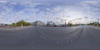 A fish eye view of an empty road in Berlin, Germany. The modern architecture and urban design create a dynamic cityscape. The clear sky at dawn adds a touch of serenity to the bustling city life.