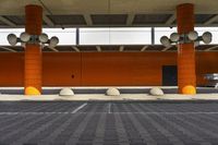 This image showcases a very modern building with orange walls and pillars. The brick flooring adds to the contemporary architecture, creating a vibrant urban setting. The overhead parking lot provides an efficient use of space while the underground parking deck offers convenience. The multicolored roof creates a striking contrast against the clear sky. This photo captures the essence of modern architecture in Berlin, Germany, and represents the vibrant and dynamic city life. It is a perfect representation of a typical day in this European city.