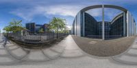 Modern architecture in Berlin's business district. A large office building with a sleek concrete facade and rectangular windows. Trees and vegetation create a calming public space. Clear sky reflects in a round mirror.