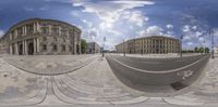 360 view in front of a round building with blue sky and clouds above it and with two bicycles parked in the foreground