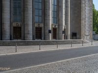 Classic architecture of Volksbühne theater in Berlin, Germany. Urban design blends with clear sky over asphalt roads. City life thrives in this European city.