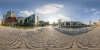 the empty city center features many nice buildings and is seen in this fish eye lens