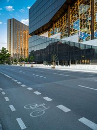 This is an image of a modern architectural structure in Berlin, Germany. The photo captures the city at dawn with a clear sky above. The building features a unique facade with glass walls and a distinct line of light. The urban design includes a wide asphalt road and a zebra crossing in the foreground. The image showcases the city's business and financial district, with office buildings and structures that represent the city's futuristic architecture. This photo offers a glimpse into city life in Berlin, highlighting the blend of modern architecture and public spaces.