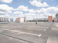an empty parking lot in a parking lot with two buildings behind it and sky with clouds