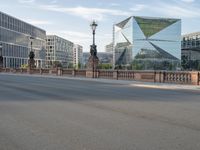 This is an image of a modern cityscape in Berlin, Germany. The architecture is a combination of old and new, with modern office buildings and bridges spanning over the asphalt roads. The clear sky enhances the city's urban design, while the bustling city life can be seen in the financial district. This photo captures the dynamic and vibrant atmosphere of Berlin, a leading business and cultural hub in Europe.