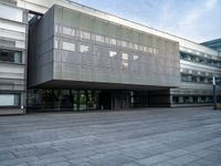 a building with an outdoor area next to it and grass growing at the side of it