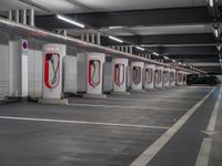 Modern urban design in Berlin, Germany. Concrete streets lead to parking garages with charging stations. Artificial light illuminates the city's electric infrastructure. Open spaces contrast with the bustling city life.